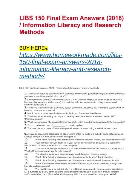 Read Online Libs 150 Final Exam Answers Kindle Editon ManyBooks